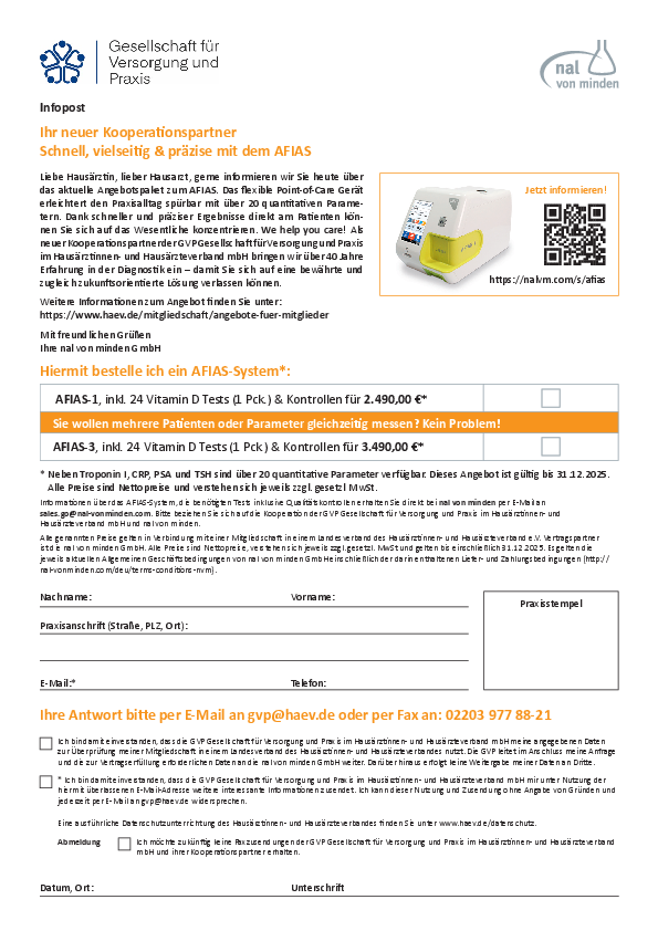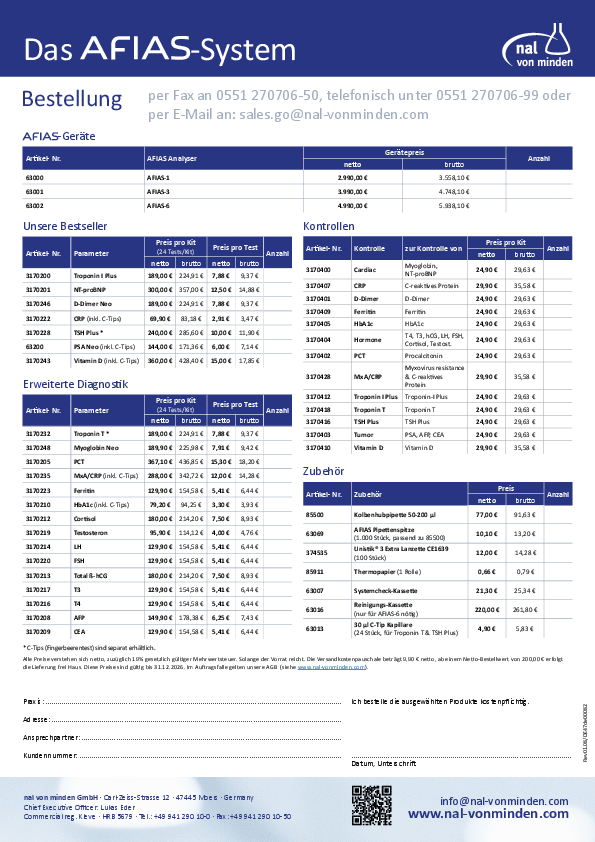 Seit über 40 Jahren steht nal von minden für zuverlässige, zertifizierte Diagnostiklösungen. Mit dem AFIAS-System bringen sie Laborqualität direkt in Ihre Praxis – für bessere Entscheidungen, mehr Effizienz und eine moderne Patientenversorgung.