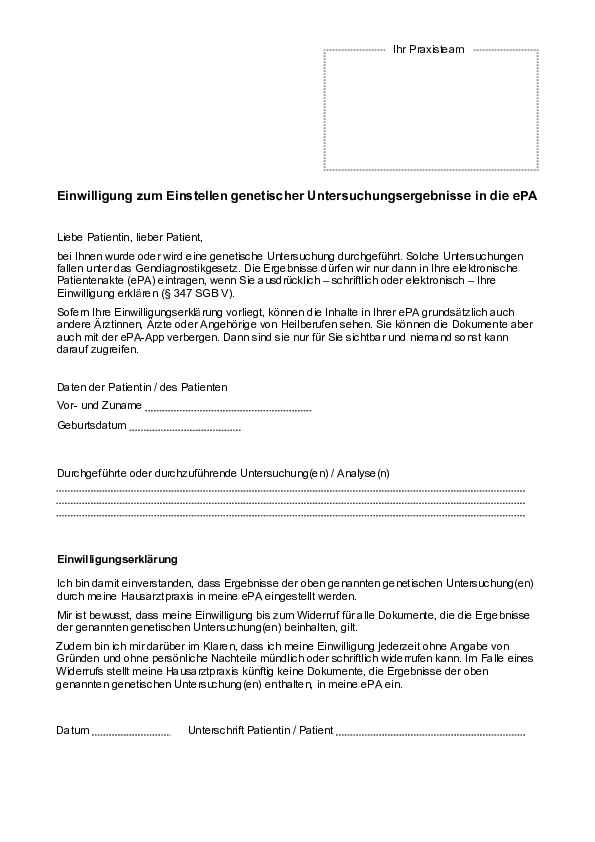 Ergebnisse genetischer Untersuchungen dürfen nur nach expliziter Einwilligung der Patientin / des Patienten in die ePA eingestellt werden. Dafür stellen wir dieses Muster zur Verfügung (DIN A4; Stand 13. Juni 2025).