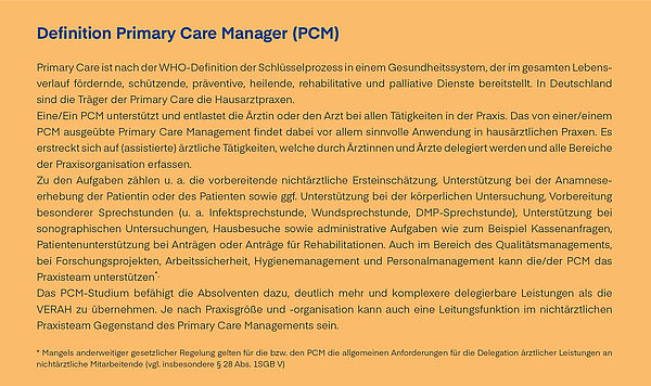 Nun können MFA, VERAH und NäPa* (und seit dem Wintersemester 2025 auch Abiturientinnen und Abiturienten als angehende MFA) ihre Kompetenzen im Rahmen des Bachelor-Studiums an der FOM Hochschule weiter vertiefen und nach erfolgreichem Abschluss als Primary Care Manager (PCM) zusätzliche Aufgaben im Praxisalltag übernehmen – sowohl in der medizinischen Versorgung als auch im Praxismanagement. Über konkrete Umsetzungen in der Praxis entscheiden dabei immer die Hausärztinnen und Hausärzte.