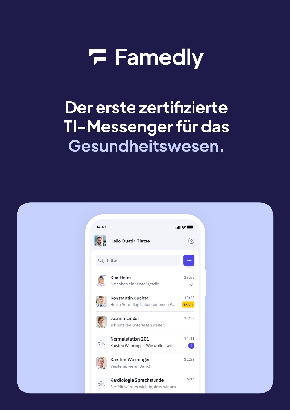 Famedly ist der führende deutsche Anbieter für digitale Zusammenarbeit im Gesundheitswesen. Ziel ist es, die Zersplitterung der Kommunikationswege zu beenden. Mit dem TI-Messenger wurde eine Plattform geschaffen, die bereits heute tausende Akteure im Gesundheitswesen vernetzt. Famedly setzen dabei konsequent auf offene Standards und höchste Datensicherheit "Made in Germany".