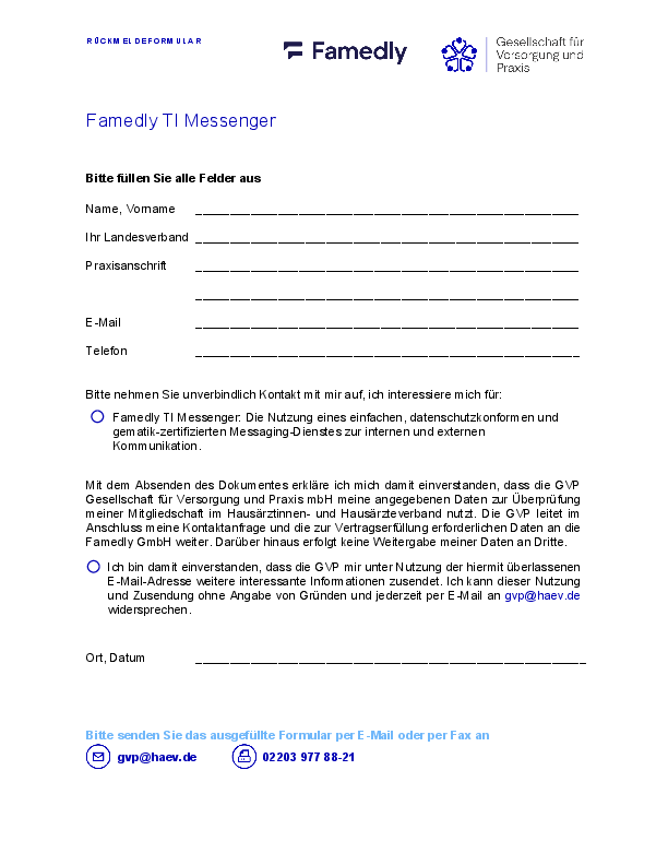 Bei Interesse senden Sie uns bitte das ausgefüllte Formular an gvp@haev.de oder wenden sich an die GVP Gesellschaft für Versorgung und Praxis im Hausärztinnen- und Hausärzteverband unter 02203 977 88-11 oder gvp@haev.de.