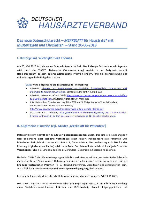 Seit dem 25. Mai 2018 gilt die neue Datenschutzgrundverordnung (DSGVO). Mit Inkrafttreten gab es Änderungen zum Datenschutz. Der Justiziar des Hausärztinnen- und Hausärzteverbandes hat dazu Informationen zusammengefasst und ein Merkblatt sowie Mustervorlagen für Hausärztinnen und Hausärzte erstellt.